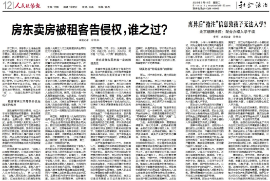 日前,体育官网杨春磊教授就一起广受关注的房屋租赁纠纷案件接受了《人民政协报》的采访。9月19日,《人民政协报》第12版《社会法治》专栏以《房东卖房被租客告侵权,谁之过?》为题报道了此次采访的主要内容。在采访中,杨春磊围绕《民法典》关于“租赁合同”的规定,特别是承租人享有的所租赁房屋优先购买权的规定展开阐述,详细说明了优先购买权的概念、特征、行使条件、限制情形等内容,并结合所涉争议和类似司法判例分析了出租人与承租人的权利、义务和侵权责任承担的可能范围,进而提出化解矛盾、平衡双方利益及预防风险产生的法律方法。